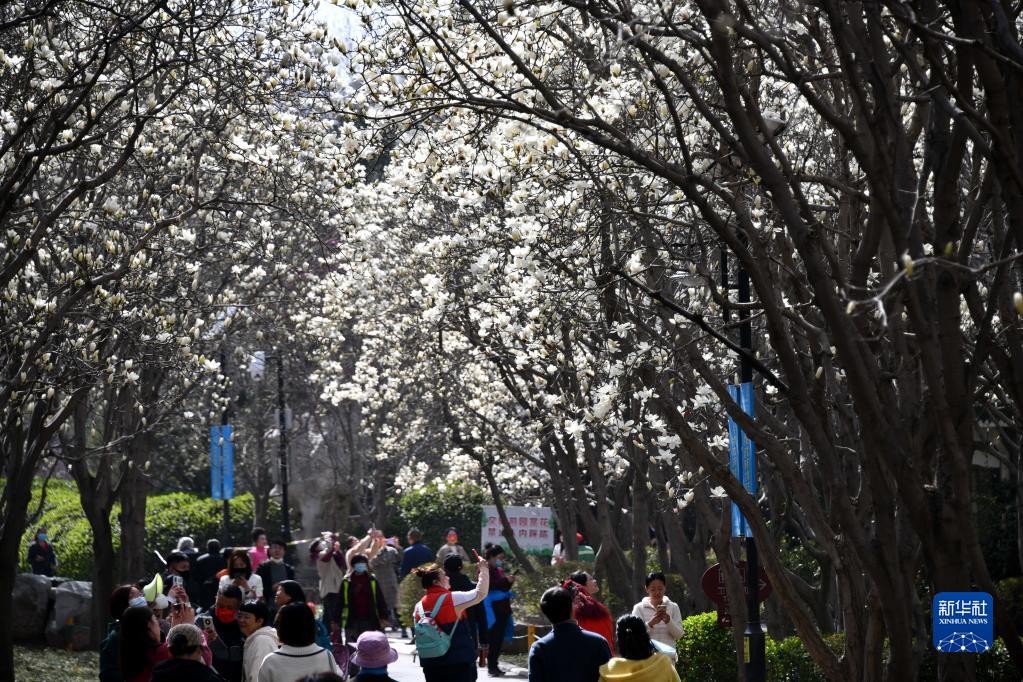 3月14日,游客在山東省濟南市百花公園拍攝盛開(kāi)的玉蘭花。