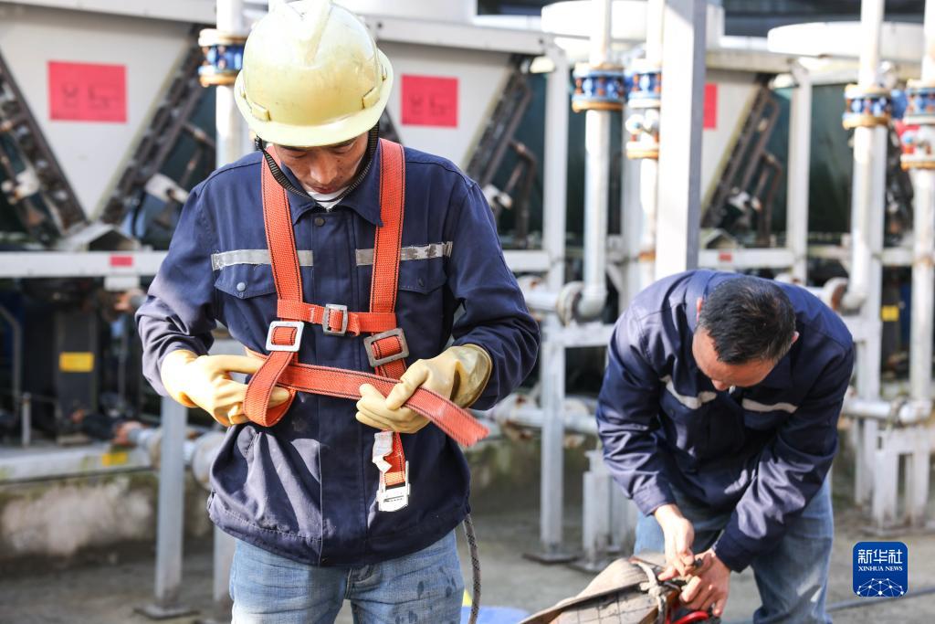 3月15日,“蜘蛛人”在系安全帶,準備進(jìn)行清洗作業(yè)。