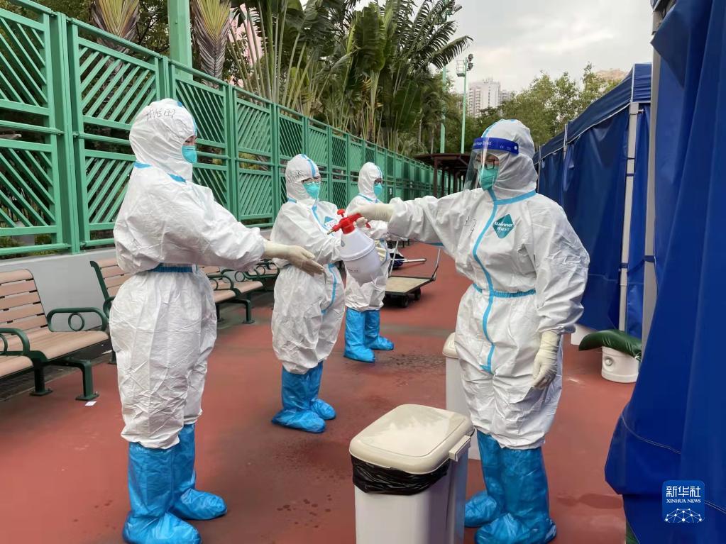 在香港馬鞍山游樂(lè )場(chǎng)采樣站工作的內地援港核酸采樣隊員互相消毒(資料照片)。