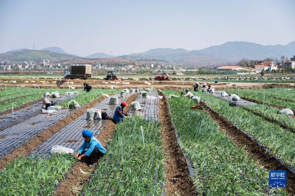 3月21日,農民在魯甸縣卯家灣安置區香蔥產(chǎn)業(yè)基地內勞作。