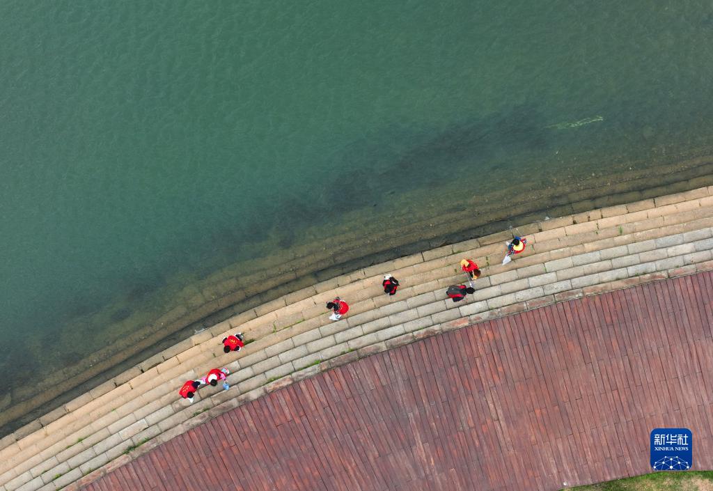 3月21日,在湖南省衡陽(yáng)市雁峰區東洲島上,南華大學(xué)土木工程學(xué)院志愿者在凈灘護水行動(dòng)中撿垃圾(無(wú)人機照片)。