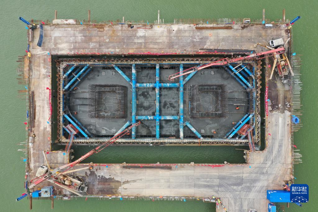 當日,在廣西上林至橫州高速公路建設施工現場(chǎng),工人們加班加點(diǎn)完成控制性工程——西津郁江特大橋水中承臺的澆筑作業(yè)。