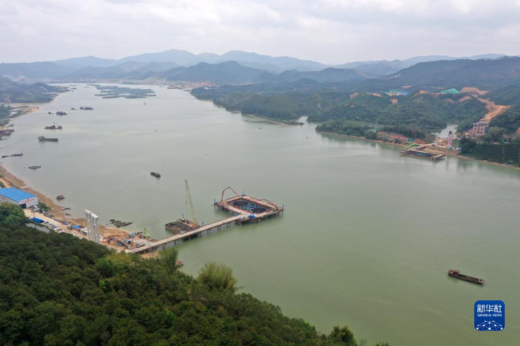 廣西上林至橫州高速公路西津郁江特大橋建設現場(chǎng)(3月21日攝,無(wú)人機照片)。