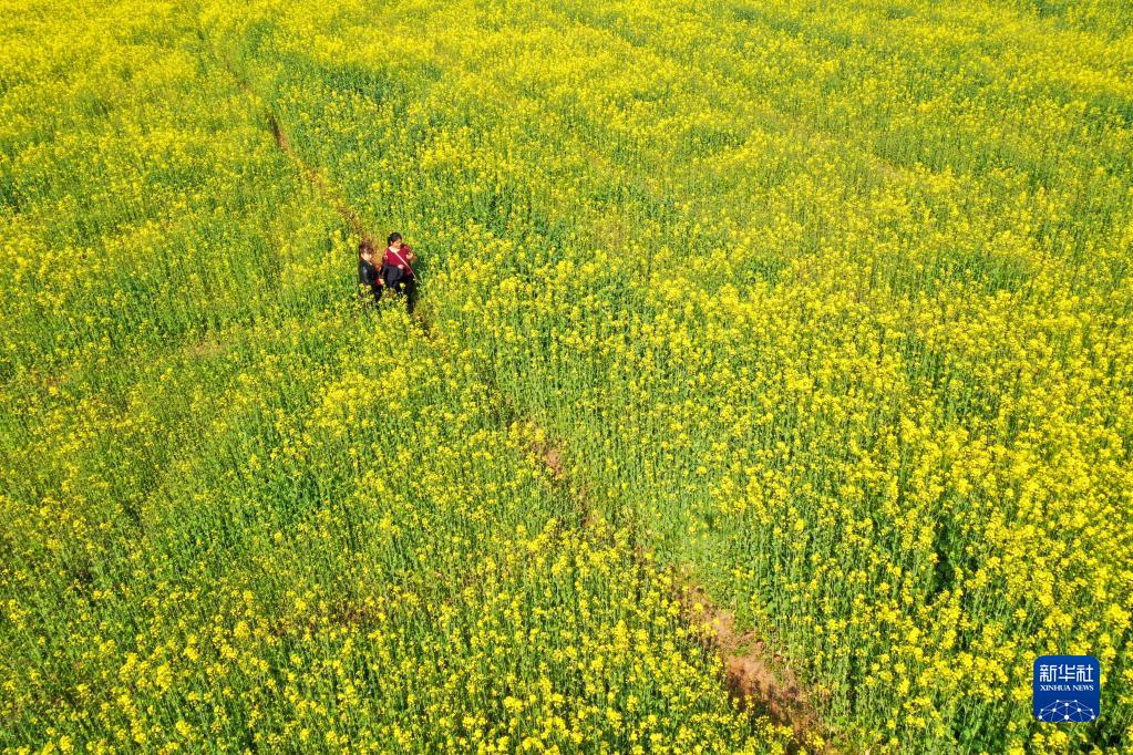 3月8日,游客在重慶市大足區中央城市花海公園的油菜花田游玩,該片油菜花田均為“慶油系列”油菜品種(無(wú)人機照片)。