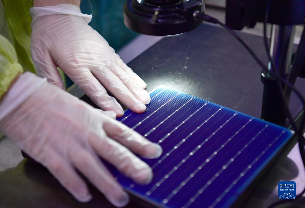 3月25日,在隆基單晶硅太陽(yáng)能電池工廠(chǎng)內,工作人員用工業(yè)放大鏡檢查電池片。