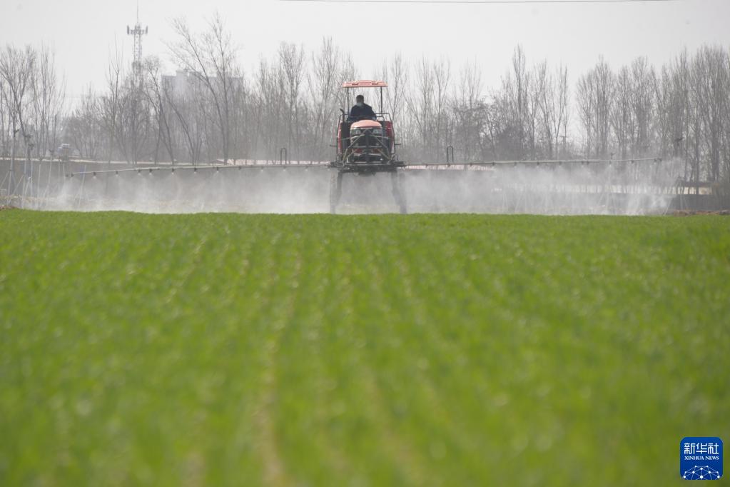 3月26日,在河北省保定市望都縣寺莊鎮寺莊村,植保人員駕駛植保機械在麥田里噴灑除草劑。