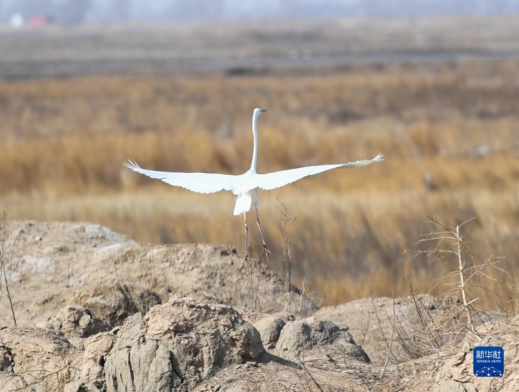 3月30日,一只白鷺在呼和浩特市土默川平原上嬉戲。
