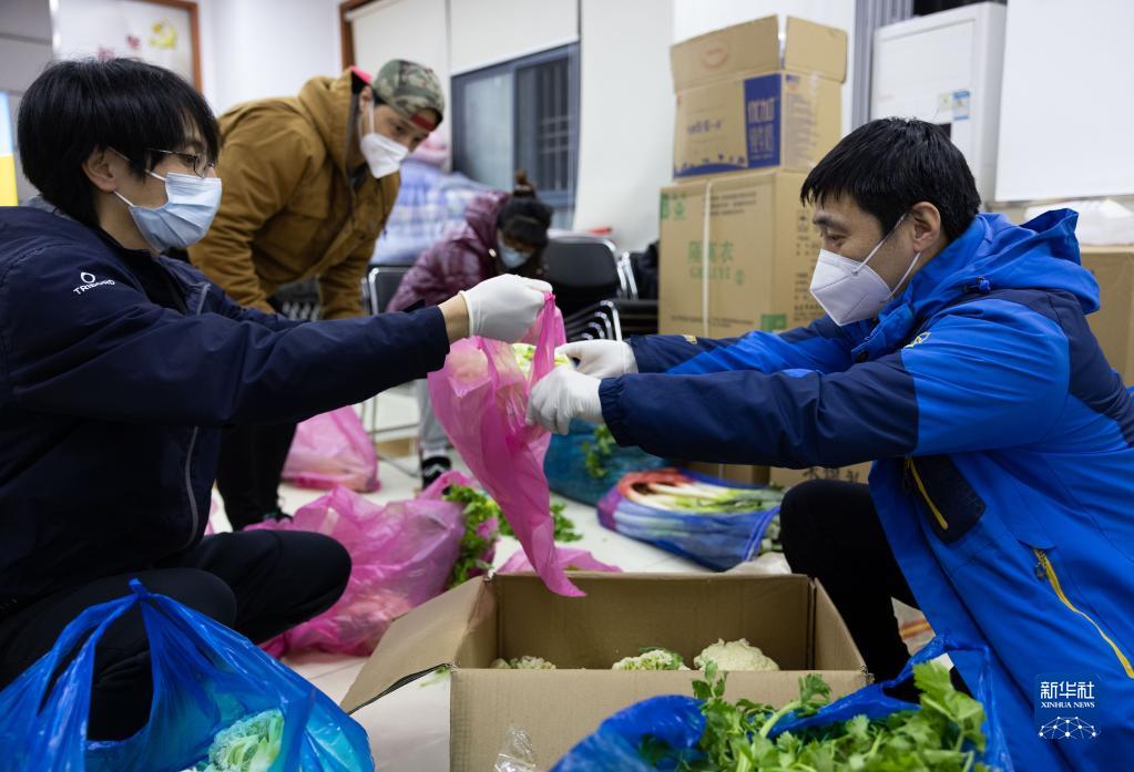 3月31日晚,在上海市中遠兩灣城小區,街道和社區干部把蔬菜分發(fā)裝袋。