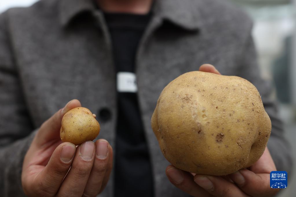 在青海省西寧市大通回族土族自治縣景陽(yáng)鎮山城村,大通縣農業(yè)技術(shù)推廣中心副主任石玉文展示左邊的微型薯(原原種)和右邊培育成熟的馬鈴薯(3月24日攝)。