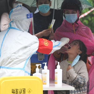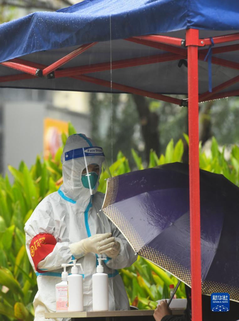 4月1日,在??谑旋埲A區金貿街道國貿社區新冠肺炎核酸采樣點(diǎn),居民接受核酸采樣。