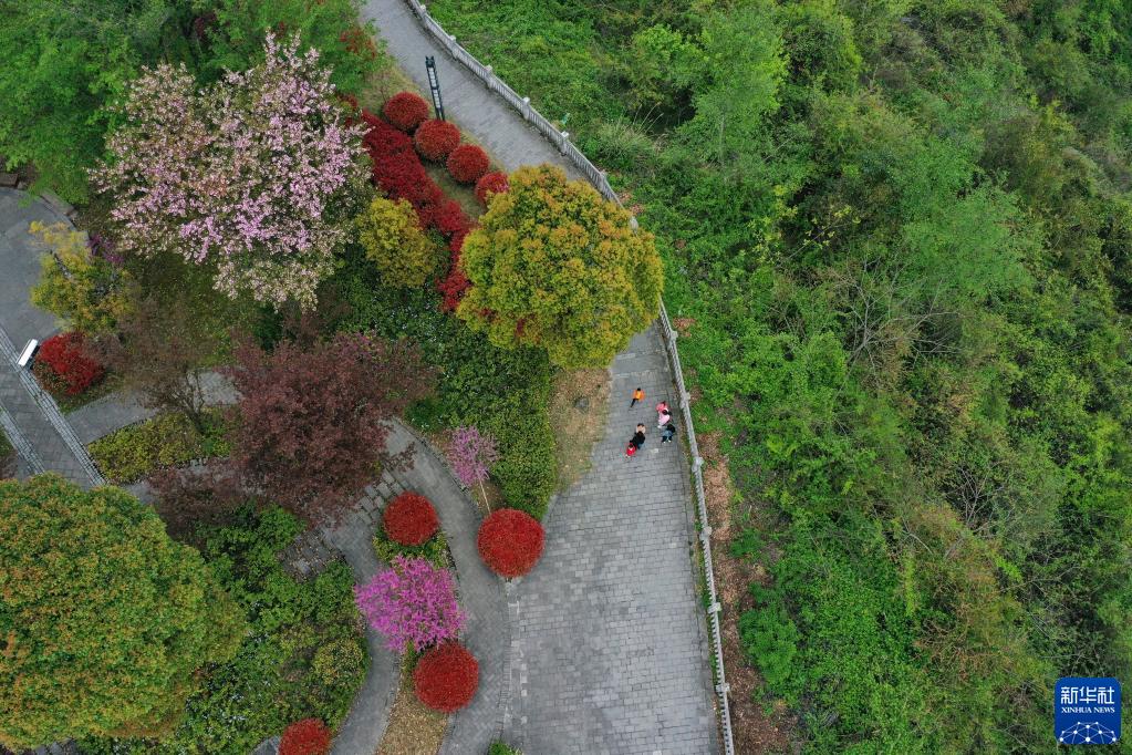 4月4日,在重慶市酉陽(yáng)土家族苗族自治縣一“口袋公園”,居民在踏青賞景(無(wú)人機照片)。