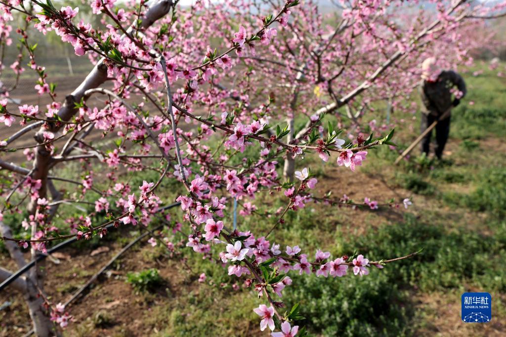 4月10日,山東省棗莊市齊村鎮前良村農民在桃園里勞作。