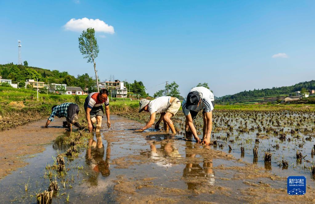 4月10日,村民在貴州省黔西市錦星鎮新街社區平整秧田。