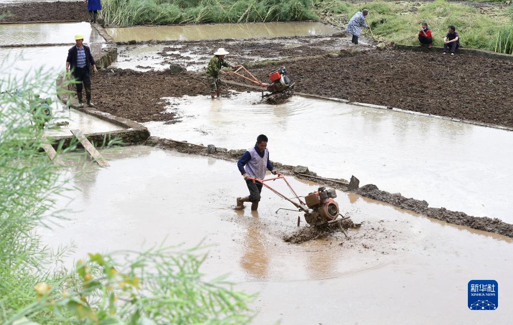 4月10日,云南省羅平縣大水井鄉楊家寨村的農民駕駛旋耕機在田間耕作。