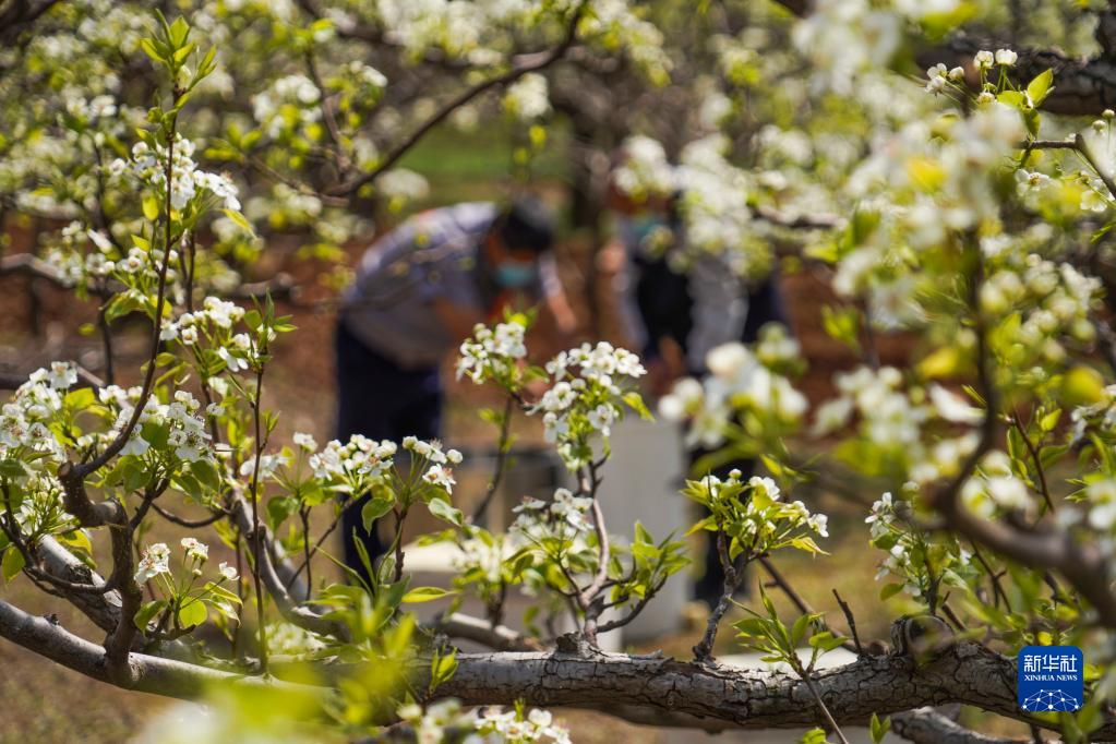 4月12日,河北唐山遵化市娘娘莊鄉一家養蜂專(zhuān)業(yè)合作社的農民在梨樹(shù)果園忙碌。