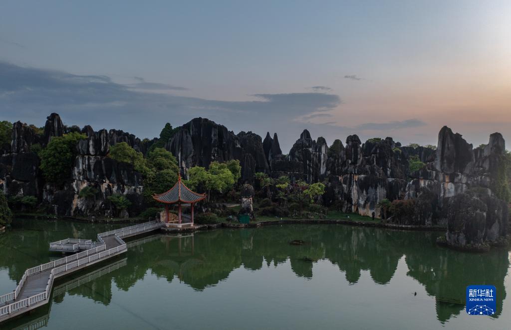 這是4月9日拍攝的石林日落景觀(guān)(無(wú)人機照片)。