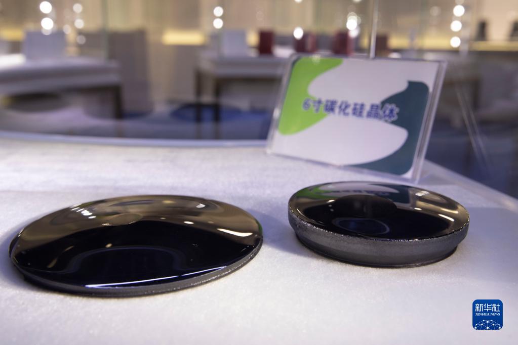 4月24日,在哈爾濱科友半導體產(chǎn)業(yè)裝備與技術(shù)研究院有限公司展廳內展示的6寸碳化硅晶體。
