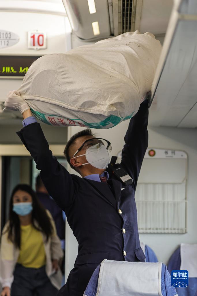 在開(kāi)往烏魯木齊方向的“和田玉龍號”列車(chē)上,列車(chē)員為旅客擺放行李(4月28日攝)。