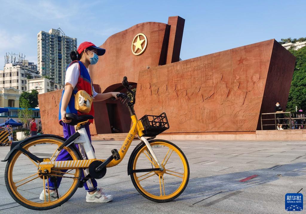 5月3日,廣州市第十三中學(xué)學(xué)生陳渝文利用假期在團一大廣場(chǎng)進(jìn)行志愿服務(wù),她將隨意擺放的單車(chē)搬至廣場(chǎng)旁的停放點(diǎn)。