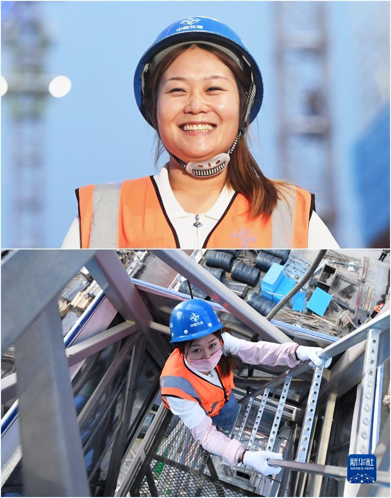 拼版照片:上圖為中交四公局雄安新區啟園項目塔吊司機向慧(4月26日攝);下圖為向慧在雄安新區啟園項目建設工地攀爬塔吊(4月26日攝)。