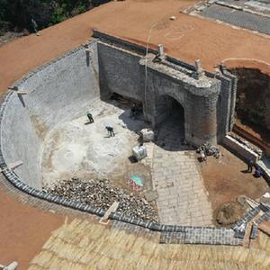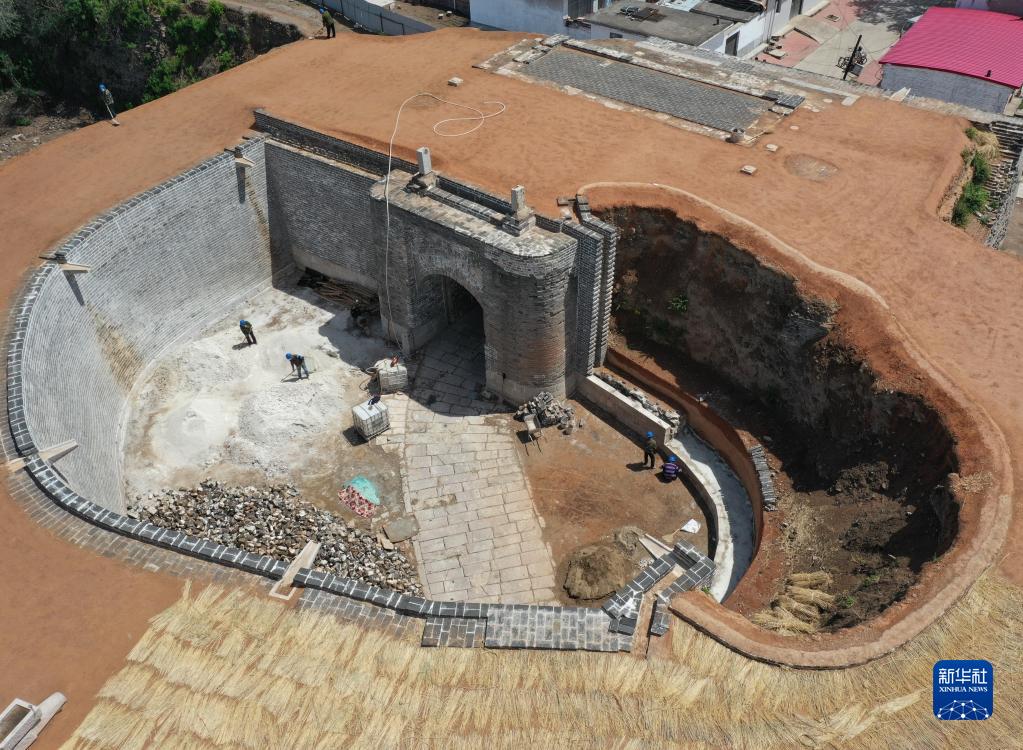 5月7日,工人在秦皇島市盧龍縣城的明代永平府城墻西門(mén)甕城修繕工程現場(chǎng)施工(無(wú)人機照片)。