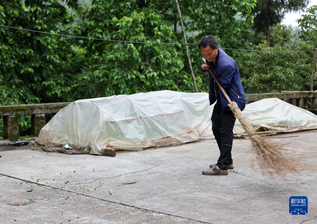 趙友良在打掃自家院壩(5月12日攝)。