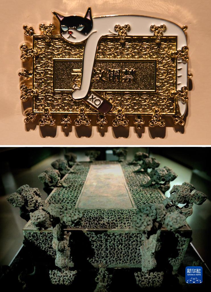 拼版照片:上圖為2022年5月17日拍攝的河南博物院推出的“云紋銅禁”冰箱貼;下圖為2019年11月18日拍攝的河南博物院展出的展品“云紋銅禁”。
