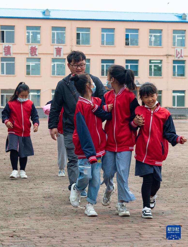 5月24日,在黑龍江省安達市任民鎮中心小學(xué)校園內,張雨(左二)和“村里的孩兒”音樂(lè )班的孩子走向音樂(lè )教室。