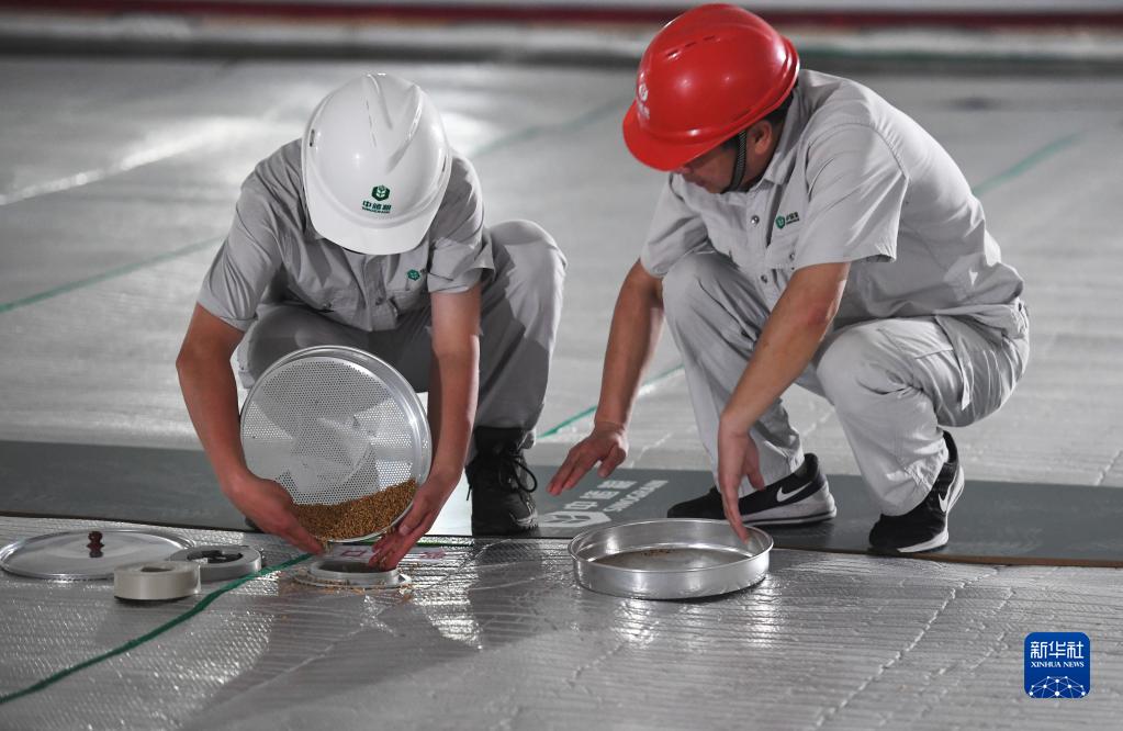 5月24日,在中央儲備糧鄧州直屬庫有限公司糧庫內,工作人員把檢查后的取樣小麥倒回取樣口。