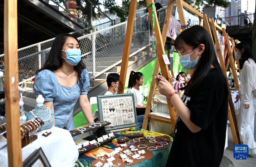 市民在西安際華3511文創(chuàng )科技園內的市集上挑選飾品(5月20日攝)。