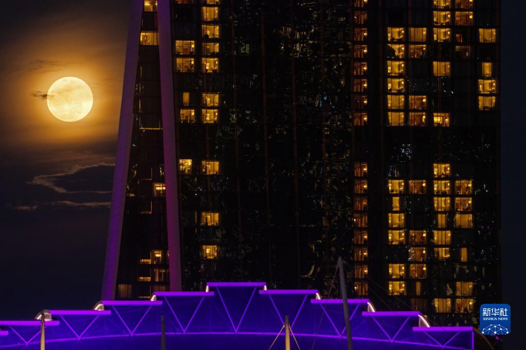 6月14日,超級月亮在新加坡濱海灣上空升起。