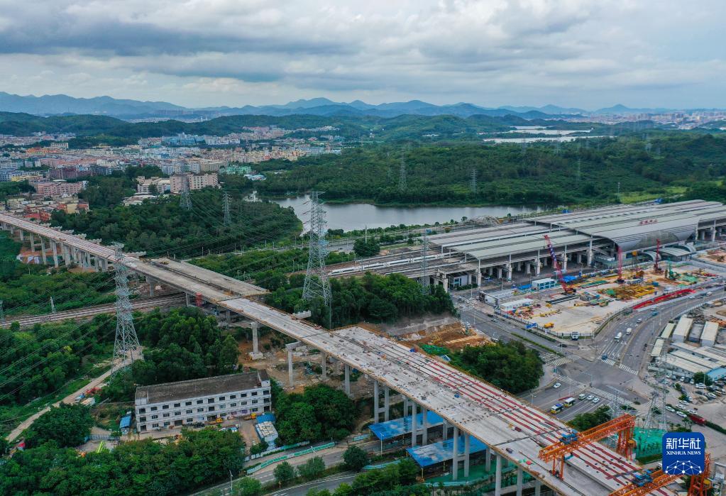 工人在深圳東部過(guò)境高速站前路高架橋進(jìn)行鋪架作業(yè)(6月17日攝,無(wú)人機照片)。