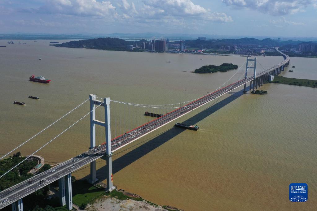 虎門(mén)大橋全景(2020年6月23日攝,無(wú)人機照片)?;㈤T(mén)大橋橫跨珠江口獅子洋水道,連接廣州市南沙區與東莞市虎門(mén)鎮。
