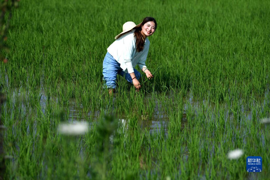 6月29日,胡盼盼在家庭農場(chǎng)稻田里補插秧苗。