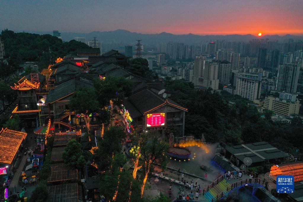 這是6月1日拍攝的重慶陶然居大觀(guān)園新國潮坊景象(無(wú)人機照片)。