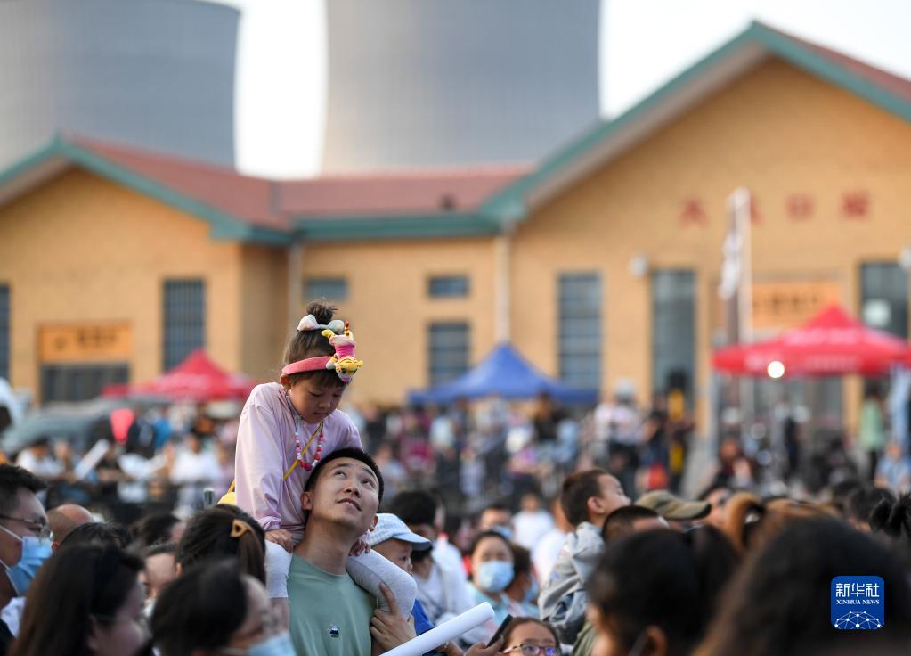 家長(cháng)帶著(zhù)孩子在大武口洗煤廠(chǎng)工業(yè)遺址公園觀(guān)看“工業(yè)之聲”音樂(lè )節演出(7月9日攝)。
