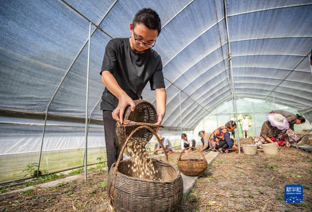 7月14日,在重慶市巫溪縣蘭英鄉西安村,村民將采挖的貝母集中堆放在竹籃內。