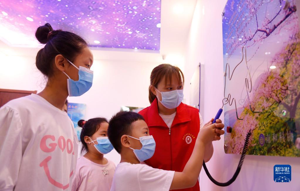 7月17日,在河北省邢臺市南和區和陽(yáng)鎮和韻社區人文公共空間,文明實(shí)踐志愿者為孩子們講解科普知識。