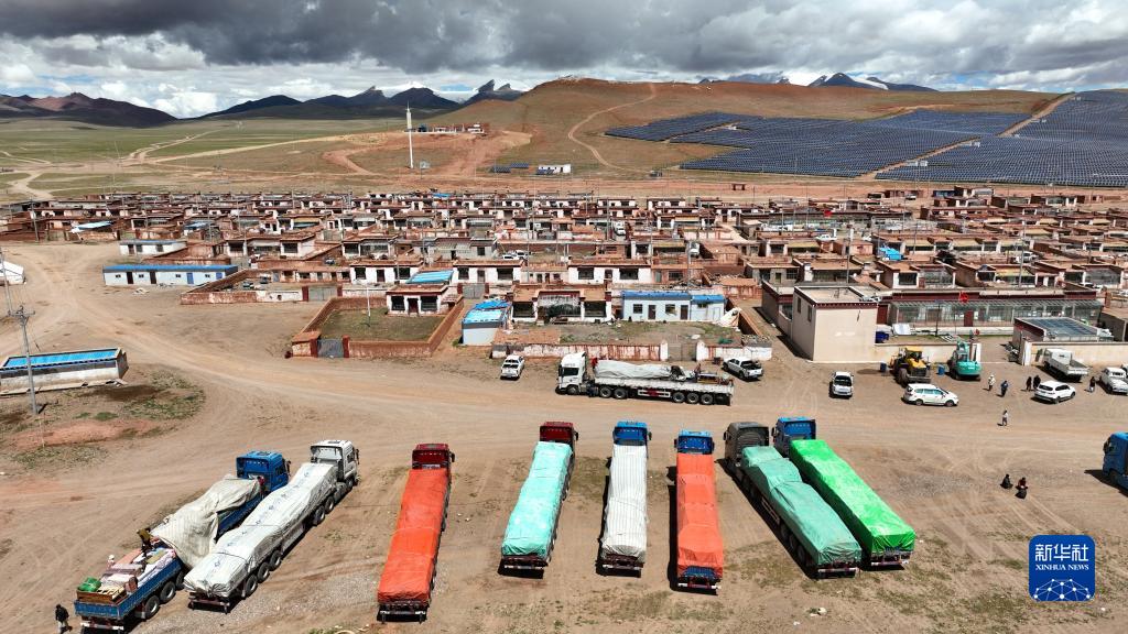 在雙湖縣多瑪鄉仲魯瑪村,運輸家具的貨車(chē)整裝待發(fā)(7月13日攝,無(wú)人機照片)。