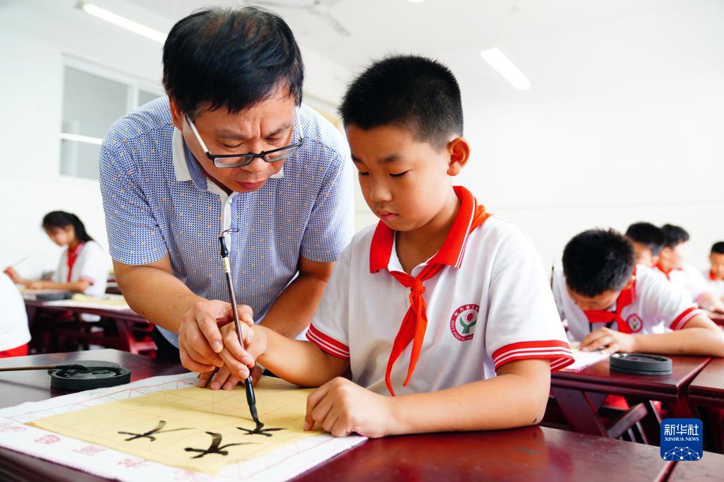 7月28日,在山東省齊河縣祝阿鎮馬坊社區鄉村“復興少年宮”,田偉在教小朋友練習書(shū)法。