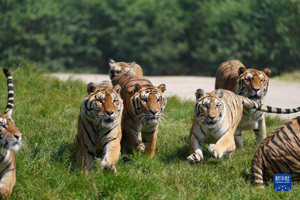 7月29日,東北虎在中國橫道河子貓科動(dòng)物飼養繁育中心野化訓練區活動(dòng)。