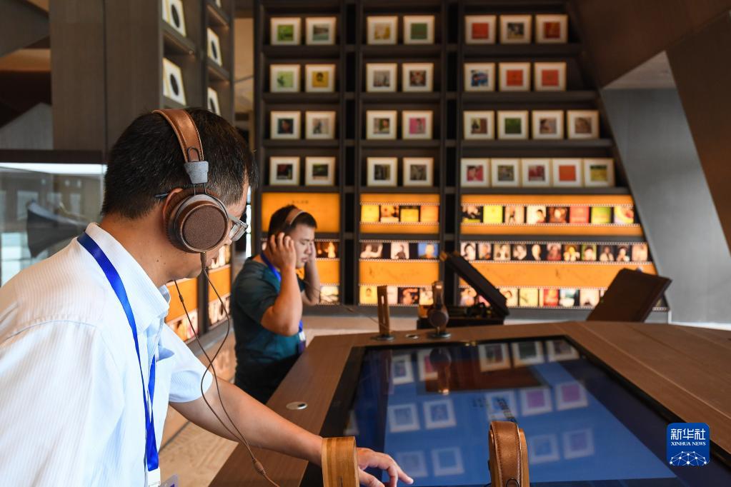 7月30日,參觀(guān)者在中國國家版本館廣州分館中國流行音樂(lè )版本展示區體驗試聽(tīng)。