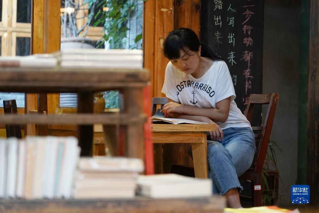 一名游客在留壩縣城老街上的一家書(shū)屋內讀書(shū)(2020年9月3日攝)。