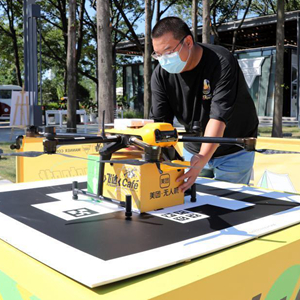 8月4日,工作人員將裝有咖啡的紙箱安放在位于無(wú)人機下方的貨架上。