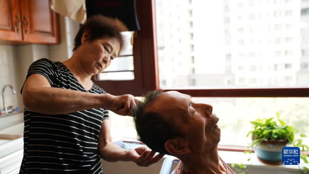 8月2日,許再霞在家中幫丈夫梳頭。