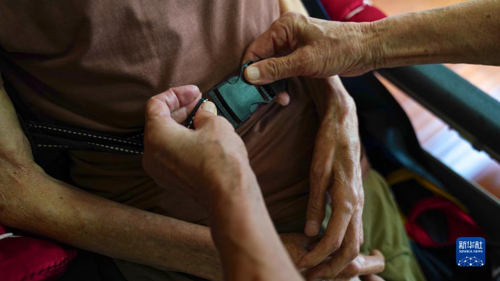 8月2日,許再霞為丈夫系好輪椅上的安全帶。