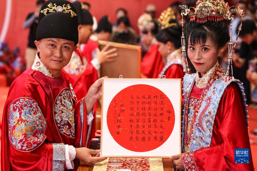 當日是七夕,2022(壬寅)年貴陽(yáng)孔學(xué)堂中華婚禮在貴陽(yáng)孔學(xué)堂舉辦,12對新人身穿中式婚服通過(guò)合巹禮、解纓結發(fā)、共書(shū)婚帖等方式完成傳統婚禮儀式。
