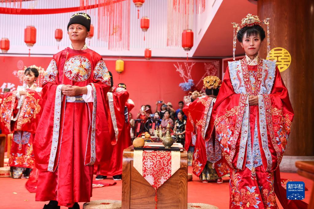 當日是七夕,2022(壬寅)年貴陽(yáng)孔學(xué)堂中華婚禮在貴陽(yáng)孔學(xué)堂舉辦,12對新人身穿中式婚服通過(guò)合巹禮、解纓結發(fā)、共書(shū)婚帖等方式完成傳統婚禮儀式。