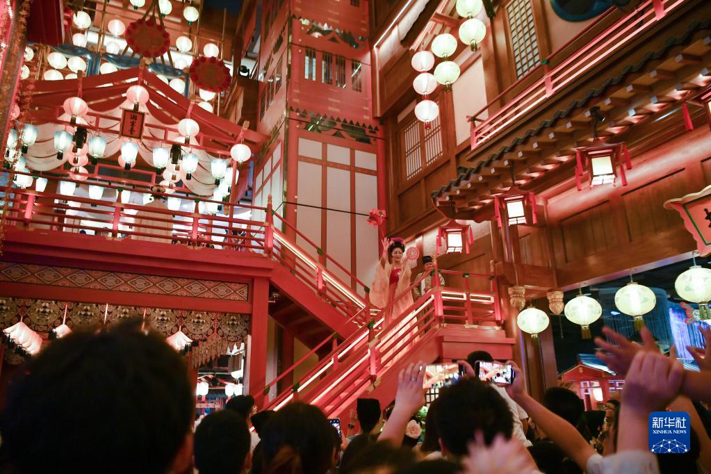 當日是農歷七月初七,在陜西省西安市曲江新區的“長(cháng)安十二時(shí)辰”主題街區,人們參與體驗拋繡球、寫(xiě)婚書(shū)等傳統民俗,用別樣的方式歡度七夕佳節。