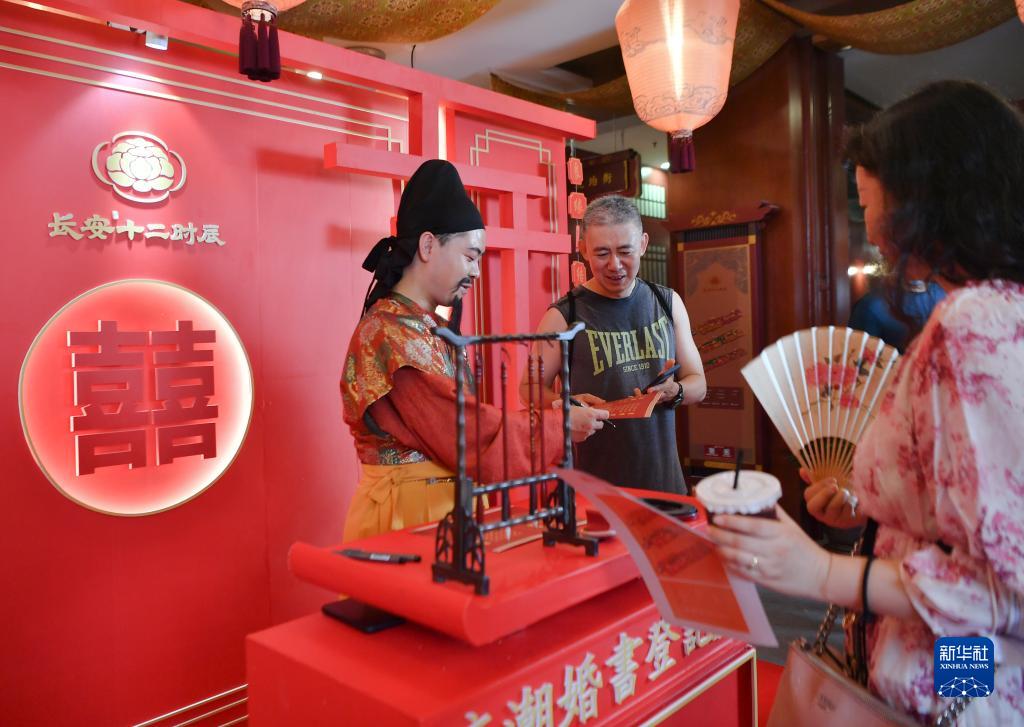8月4日,演員(左)在“長(cháng)安十二時(shí)辰”主題街區向游客贈送“婚書(shū)”。